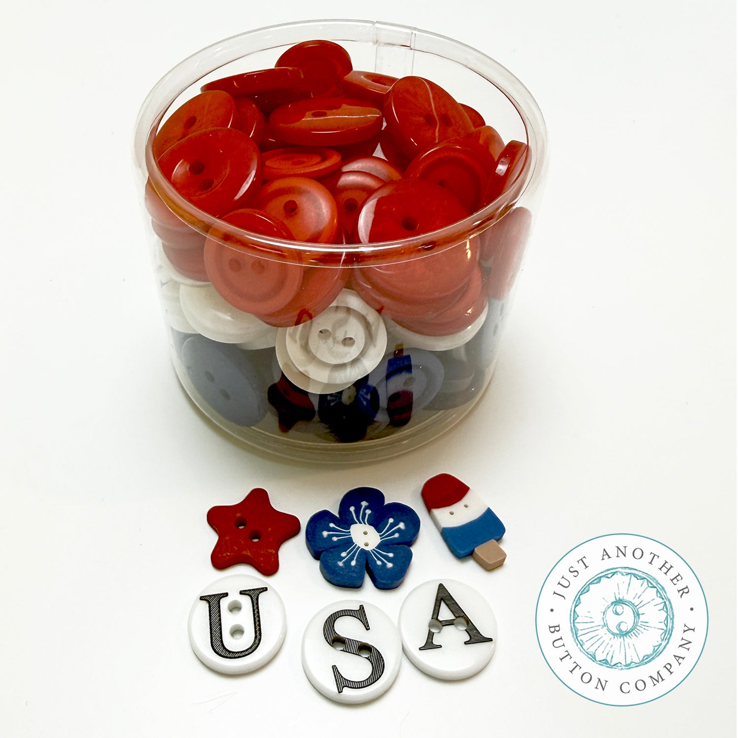 USA Mix is 3" clear container filled to the brim with over 100 hand-dyed buttons in vibrant red, white and blue--plus a few fun extras!