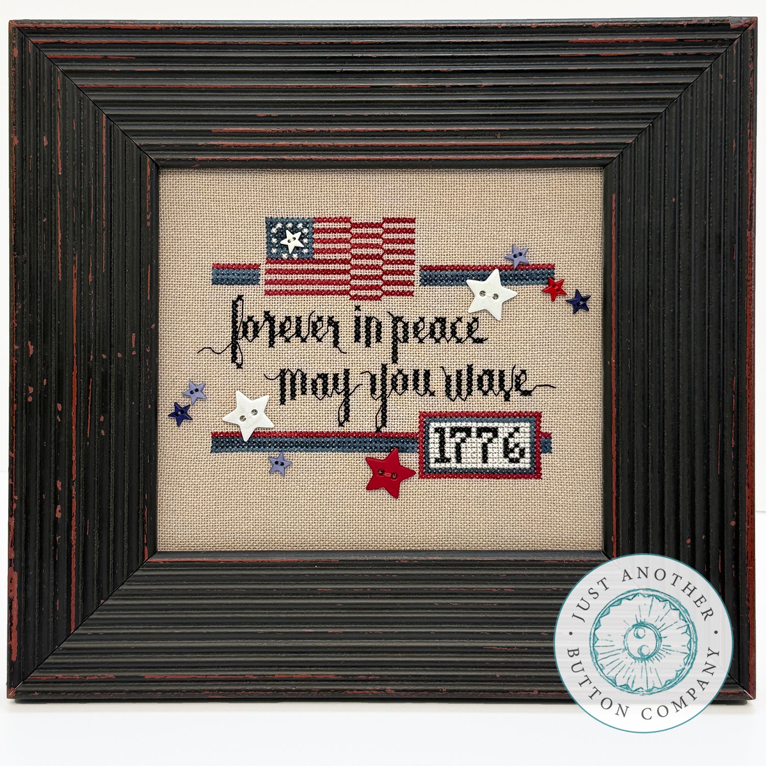 Forever in Peace is a JABC ButtonStitch Mini--sweet and simple chart for a button-sized project.  Buttons (10) are included with the chart purchase.  Model uses C&C Cherry Cobbler and Stargazing.