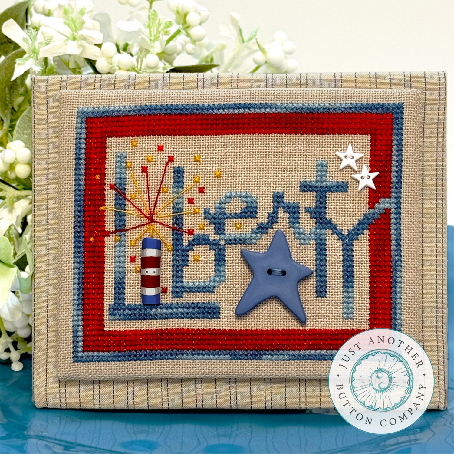 Liberty Star is a JABC ButtonStitch Mini--sweet and simplet chart for a button-sized project.  Buttons (4) are included with the chart purchase.  Model uses WDW Union Blue and Louisiana Hot Sauce.