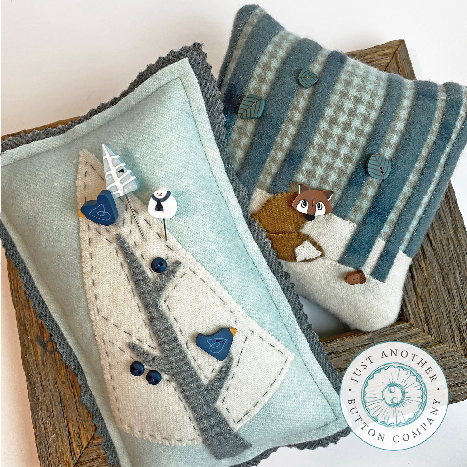 Pre-packaged JABC button assortment for a published chart or pattern by Just Another Button Company. This pack includes the buttons shown on both pin pillows. Join the Pin Lover's Club to find the Frosty Forest Pin-Mini and free patterns for these pin pillows!