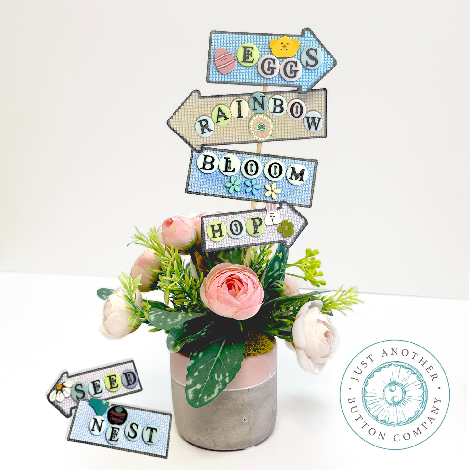 Set of 3 5/8" letter buttons, dyed in soft shades, plus a bunny and a flower handmade from clay.  Includes a chart to cross stitch the sign-shapes on perforated paper.
