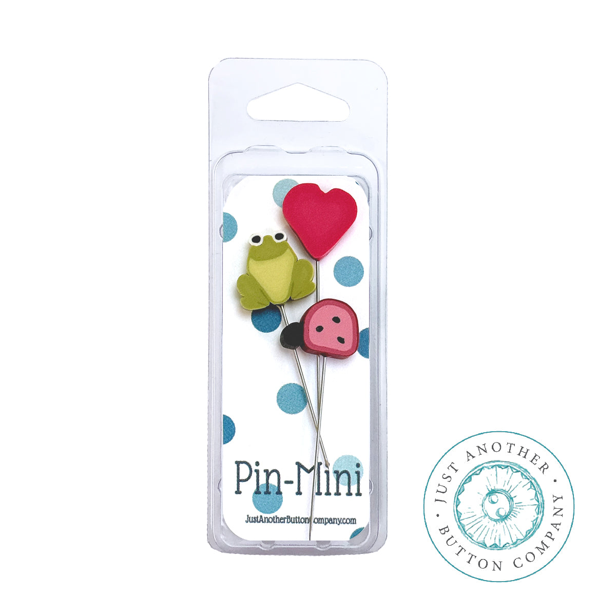 Handmade JABC button slice mounted on a stainless steel sewing pin. Assortment of three, packaged in a clam shell. Use to embellish pincushions.